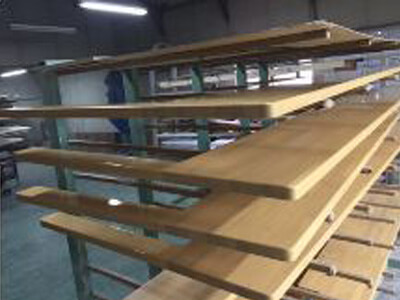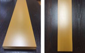 集成材やMDFなどの基材に木目を印刷することによりオークやヒノキといった樹種に疑似塗装することができます。MDF単体や針葉樹などの集成材に下地を隠す下塗り塗料を塗装します。